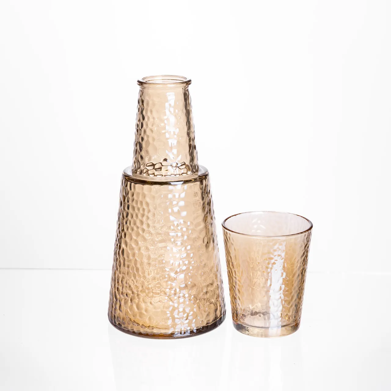 Этот кувшин объемом 800 мл вместе со стаканом, рассчитанным на 250 мл, представляет собой удобный и функциональный набор для подачи напитков. Изготовлен из прочного рифленого стекла, он сочетает практичность и эстетичность. Коричневый цвет изделия придает ему особую теплую атмосферу и дополнит интерьер кухни, офиса или гостиной.