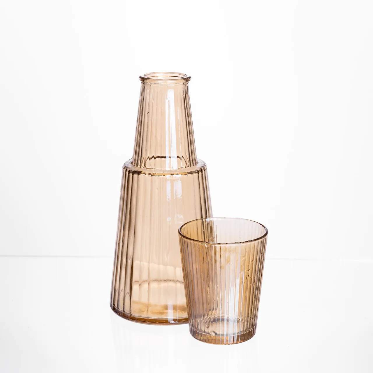 Набор состоит из кувшина объемом 800 мл и стакана объемом 250 мл, выполненных из прочного рифленого стекла с коричневым оттенком. Кувшин имеет высоту 23 см, диаметр верхней части 4 см, нижней — 10 см, а стакан высотой 9,5 см дополняет комплект. Такой набор идеально подходит для хранения и подачи различных напитков — воды, компота, сока или лимонада.