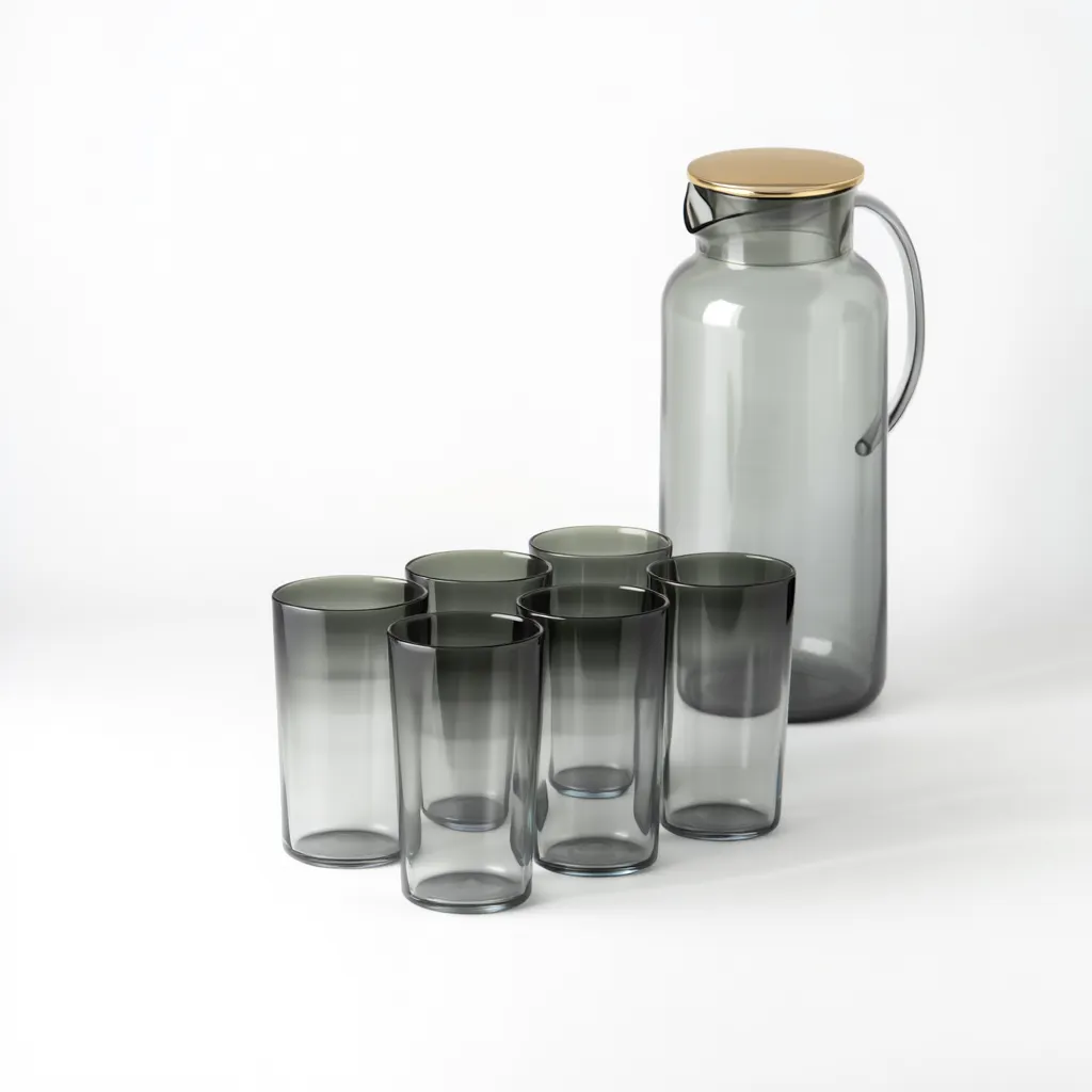 Набор для напитков в комплекте из 7 предметов HP-19-FX7 сочетает в себе изысканность и практичность. Центральным элементом является кувшин объемом 1,5 литра с удобной ручкой и надежной крышкой золотистого цвета, которая защищает напитки от пыли и сохраняет их свежесть. Благодаря гладкому, полупрозрачному дымчатому стеклу графитового цвета, набор привносит современный и элегантный вид в интерьер.