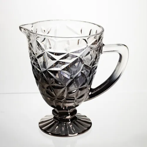 Кувшин для напитков из толстого стекла объемом 1.2 л. Прозрачный материал и сбалансированная форма обеспечивают удобство использования и аккуратный внешний вид. Поверхность кувшина полностью украшена рельефным геометрическим узором из треугольных граней. В нижней части грани имеют вырезы, создающие выразительный трехмерный эффект и заметную игру света. Декор равномерный и не перегружает общий дизайн. Высота 20 см и диаметр 14 см обеспечивают стабильность на столе. Конструкция на ножке с плавным переходом в основание придает изделию целостности, а толстое стекло подчеркивает практичность и надежность. Основные характеристики кувшина для напитков: Тип: кувшин для напитков; Объем: 1.2 л; Материал: толстое стекло; Высота: 18 см; Диаметр: 13 см; Конструкция: на ножке. Кувшин идеально подходит для использования дома, в кафе или на праздничном столе. Его можно мыть вручную или в посудомоечной машине. Посуда, сочетающая функциональность и привлекательный вид для ежедневной и особой сервировки.