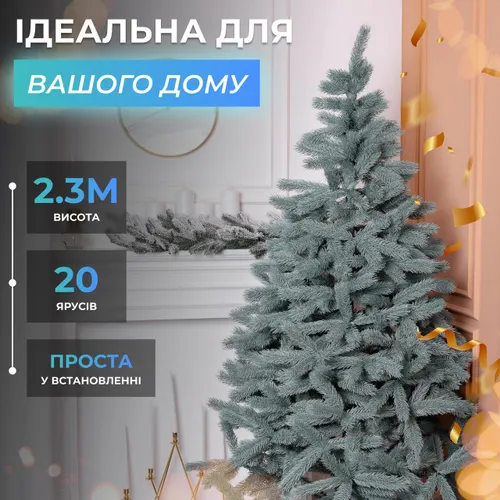 Эта искусственная елка высотой 2,3 метров подходит для украшения жилых помещений, торговых залов, офисов и общественных пространств. Ее голубой цвет гармонирует с различными декоративными элементами, такими как серебристые шары, белые снежинки и разноцветные гирлянды.