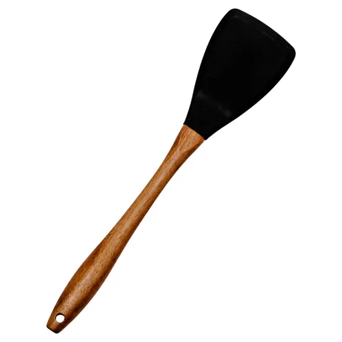 Деревянная ручка отличается природной текстурой, приятной на ощупь и обеспечивает надежный захват. Дерево не нагревается во время готовки, что предотвращает ожоги и повышает безопасность работы на кухне. Цвет лопатки - черный, что делает изделие элегантным и минималистичным.