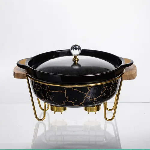 Конструкция мармита включает металлическую подставку с элементами из дерева, что гарантирует устойчивость и эстетическую привлекательность на любом столе. Стеклянная съемная крышка позволяет контролировать процесс подогрева без потери тепла и влаги.