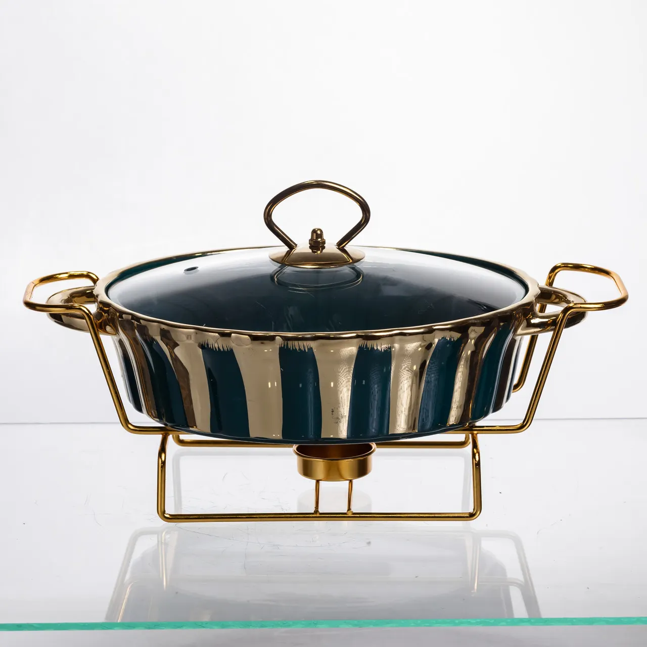 Использование фарфора в качестве основного материала гарантирует устойчивость к перепадам температур и простоту в уходе, так как фарфор легко очищается и не впитывает запахи. Благодаря металлической подставке и съемной крышке достигается комфорт в подаче горячих блюд, что особенно важно на мероприятиях с большим количеством гостей.