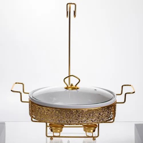 Металлическая подставка выполнена из стали с золотистым покрытием, обеспечивающим устойчивость и прочность. Она поднимает чашу над поверхностью стола, создавая элегантный внешний вид и позволяя разместить под ней свечу-таблетку для подогрева блюда (свеча в комплект не входит).
