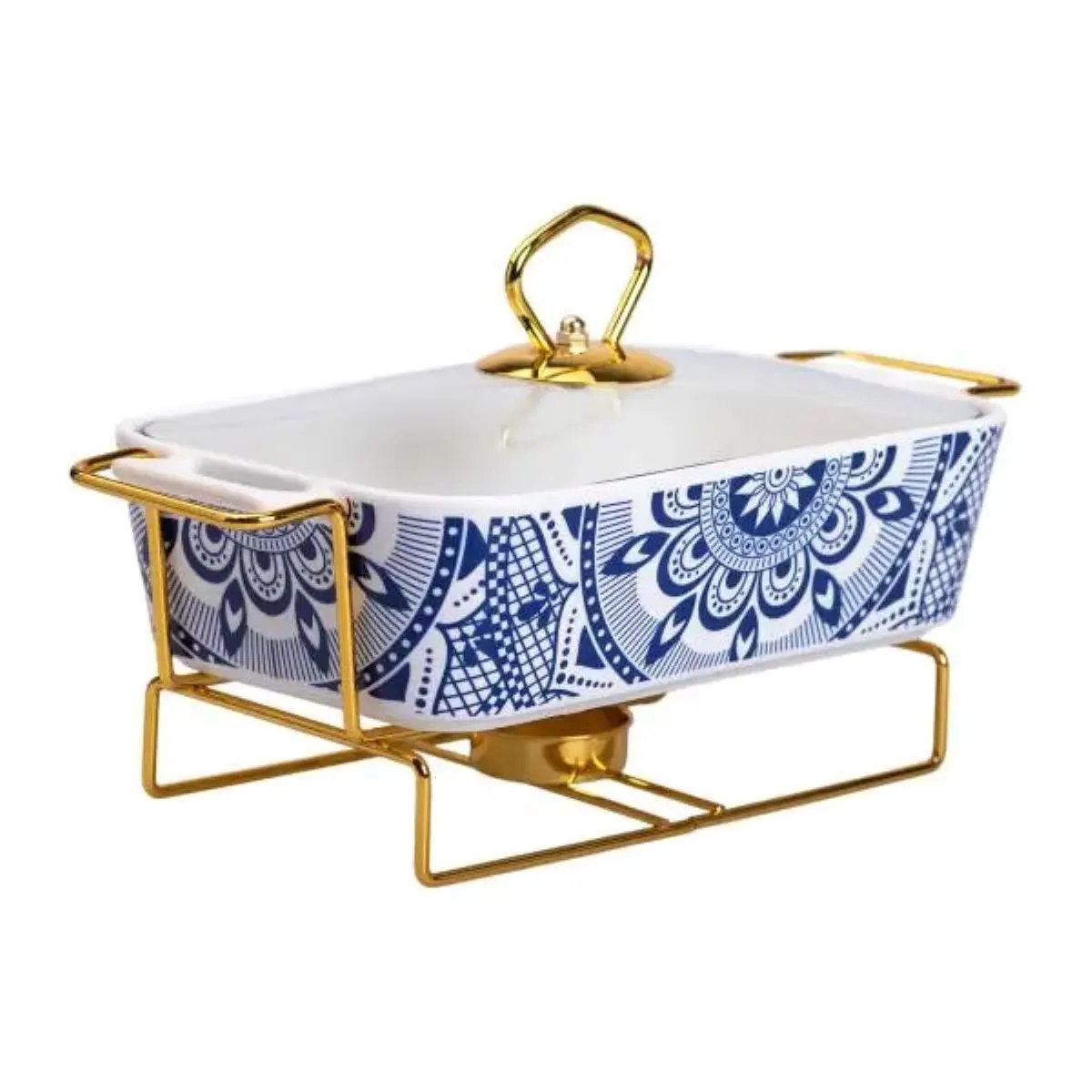 Керамический мармит со стеклянной крышкой сочетает в себе эстетичный внешний вид и практичность. Он сохраняет температуру горячих блюд, благодаря теплоемкому материалу корпуса и эффективной герметизации крышки. Металлическая подставка с источником питания на сухом топливе обеспечивает длительное поддержание тепла, что особенно важно для банкетов, ресторанов и кейтеринговых мероприятий.