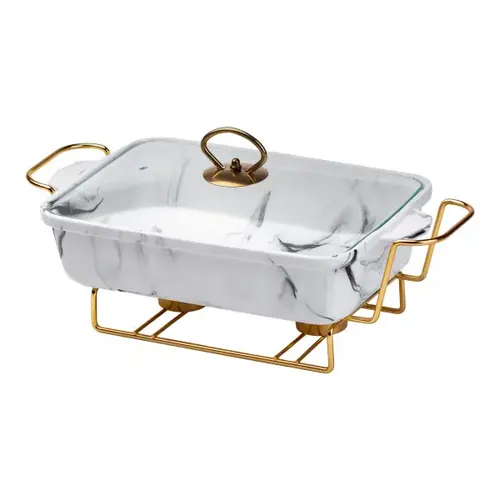 Корпус из качественной керамики обеспечивает сохранение тепла и длительное поддержание нужной температуры, а прозрачная стеклянная крышка позволяет контролировать содержимое, предотвращая потерю аромата и влаги. Подставка из нержавеющей стали надежно фиксирует мармит и служит одновременно источником нагрева от сухого топлива, что избавляет от необходимости подключения к электричеству.
