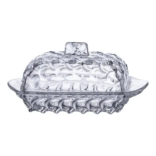 Крышка из стекла плотно закрывает масленку, предотвращая высыхание масла и сохраняя его свежесть на длительное время. Высота изделия составляет 8 см, что делает его компактным и удобным для хранения в холодильнике или на кухонном столе. Масленка имеет прямоугольную форму, обеспечивающую рациональное использование пространства.
