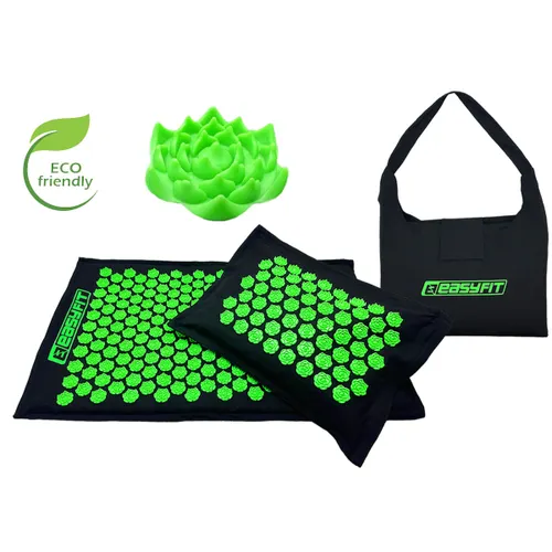 В комплект массажа входят непосредственно массажный коврик EasyFit черно-зеленого цвета, ортопедическая подушка с гречишной шелухой и удобная хлопковая сумка для хранения и транспортировки. Такое оснащение делает использование удобным и практичным в домашних условиях.