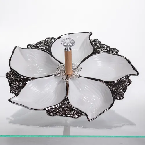 Данная менажница выделяется своим фигурным дизайном в форме цветка, который не только эстетичен, но и максимально функционален. Использование приёмов аппликации, чеканки и гравировки в декоре придаёт изделию уникальность и изысканность, которую сложно найти у стандартных моделей.
