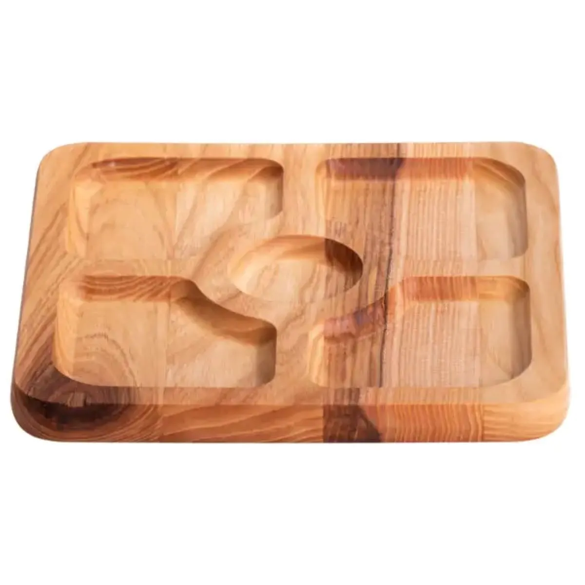 При выборе важно обращать внимание на качество материала — предпочтение лучше отдавать масляной обработке натурального дерева, что обеспечивает защиту и безопасность изделия. Размер и количество секций зависят от предполагаемого назначения: модель на пять секций удобна для разнообразных наборов закусок и подачи разных блюд одновременно.