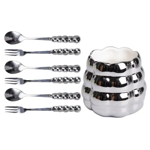 В состав набора входят три десертные вилки и три ложки, а также оригинальная подставка из керамики для удобного хранения приборов. Высота подставки составляет 7 см, а длина каждой десертной ложки и вилки — 14,5 см, что обеспечивает комфорт при использовании и эргономичность.
