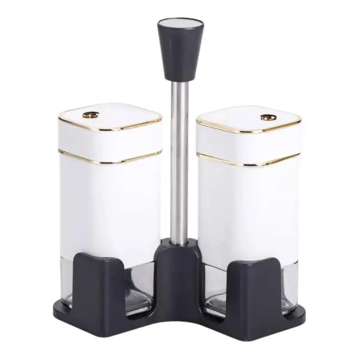 Прозрачный корпус емкостей обеспечивает визуальный контроль содержимого, что упрощает процесс замены специй и способствует эстетичному виду на кухонном столе. Подставка выполнена из пластика и металла, сочетая легкость и прочность, а встроенная ручка обеспечивает мобильность и удобство использования.