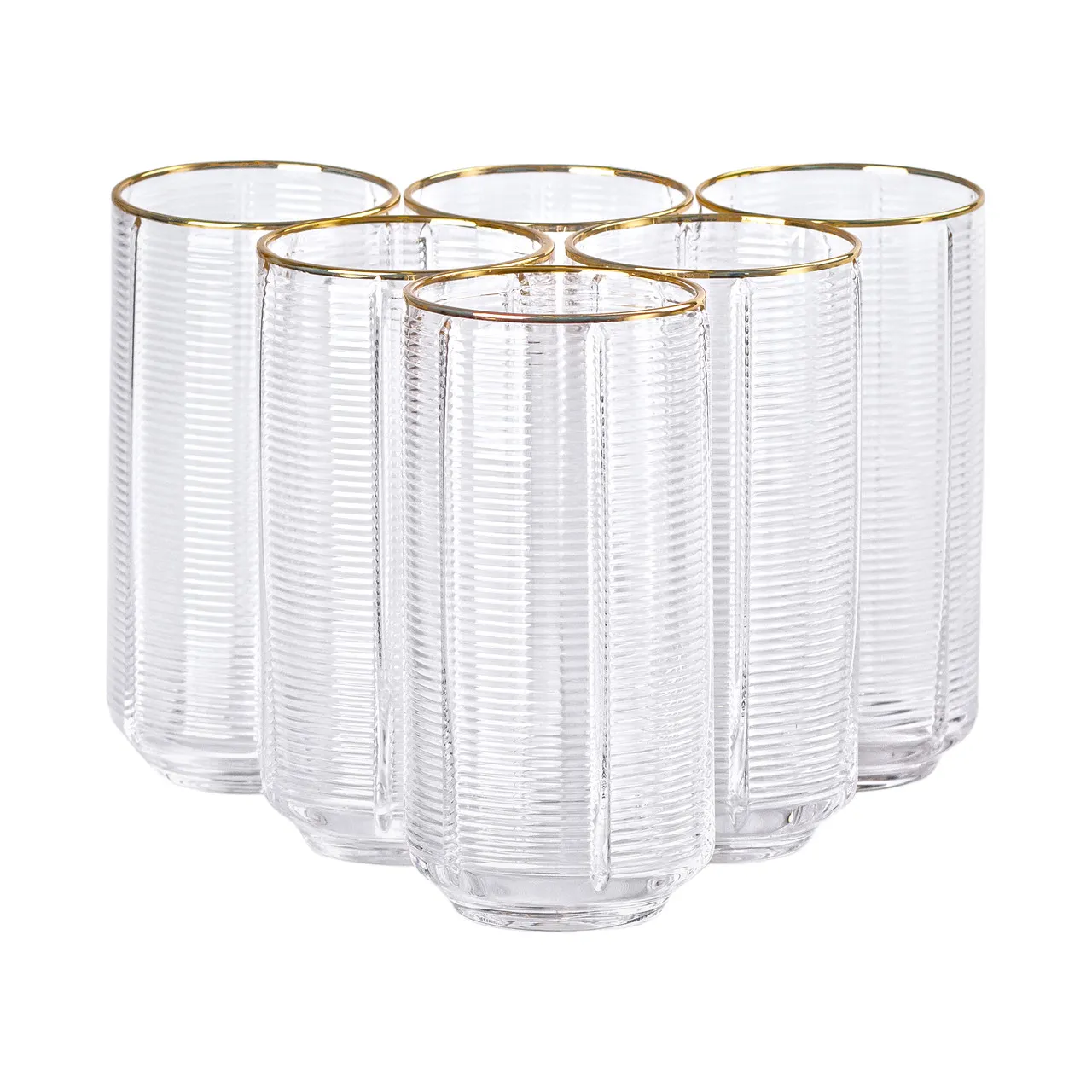 Каждый стакан высотой 14 см оснащен изящным золотым ободком, что придает набору дополнительный стиль и роскошь. Фактурная поверхность обеспечивает эффект игры света, создавая приятные визуальные акценты. Такой набор станет достойным украшением как повседневного стола, так и праздничной сервировки.