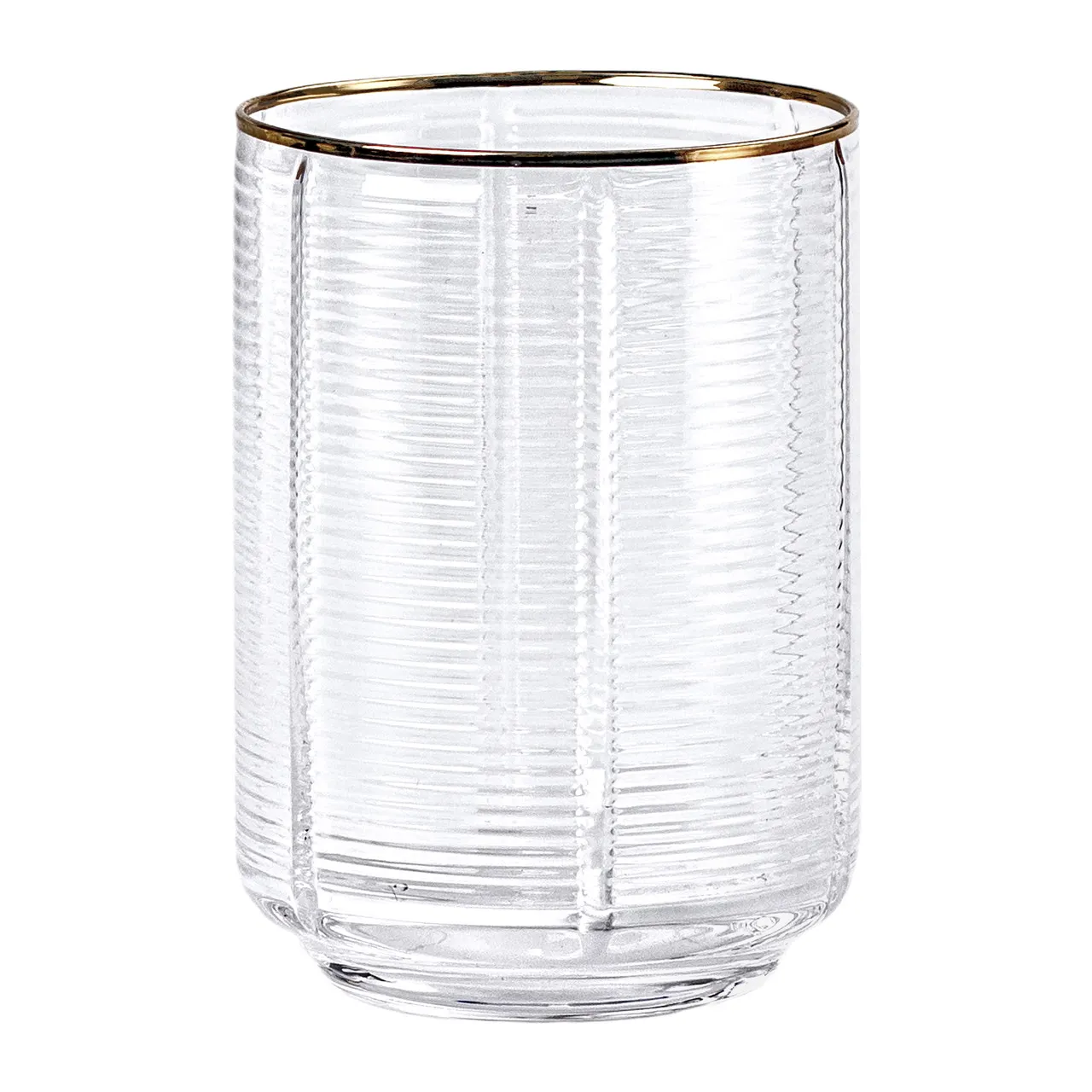 Набор стаканов состоит из шести низких ребристых стаканов, которые поражают своим стильным и изысканным дизайном. Изготовленные из прозрачного стекла с интересной ребристой текстурой, стаканы придают глубину и эстетическую привлекательность. Благодаря своей текстуре, они не только выглядят современно, но и удобно держатся в руке. Золотой ободок на верхнем крае подчеркивает элегантность стаканов и добавляет нотку роскоши. Объем каждого стакана составляет 450 мл, что делает их идеальными для разнообразных напитков — от воды и сока до коктейлей. С высотой 10,5 см эти стаканы обеспечивают удобство в использовании и легко сочетаются с другими элементами сервировки. Ребристая поверхность придает им визуального шарма и улучшает сцепление, что делает эти стаканы удобными для ежедневного использования.
