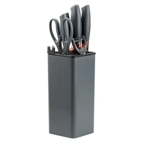 Лезвия ножей изготовлены из прочной нержавеющей стали, устойчивой к коррозии и механическим повреждениям, что гарантирует долгий срок службы без потери остроты. Подставка, выполненная из пластика, имеет настольный тип и высоту 36.5 см, что позволяет компактно разместить все элементы и сэкономить место на кухонном столе.