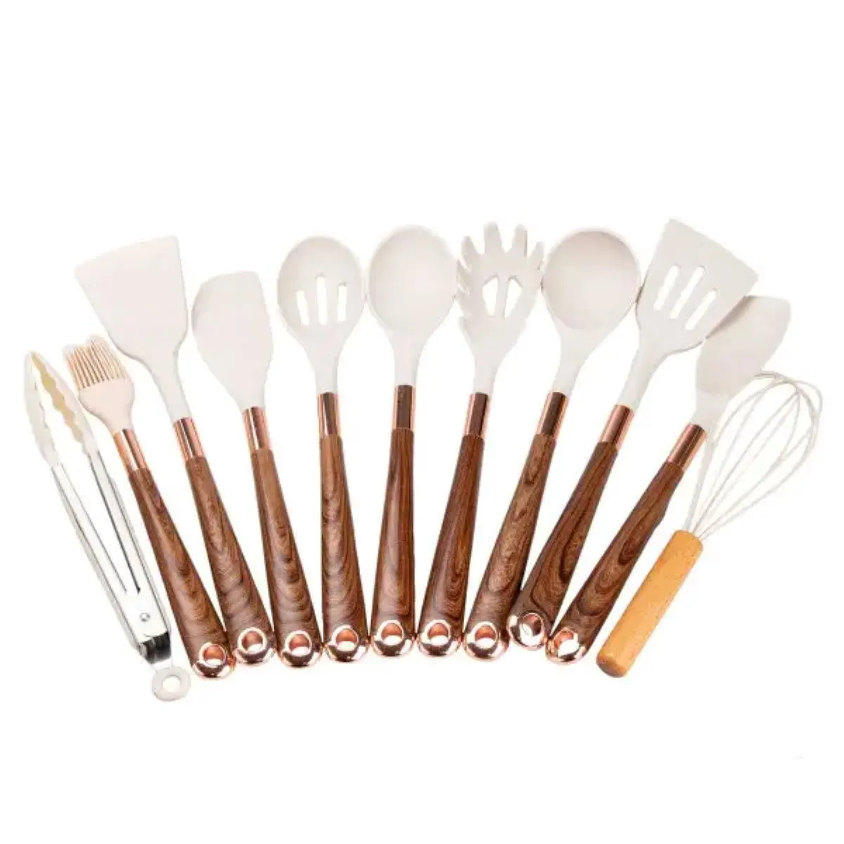 Набор состоит из разнообразных кухонных приборов, среди которых ложка для салата, поварская ложка, четыре лопатки кухонные разного назначения, венчик, щипцы, ложка для спагетти, а также специальная кулинарная кисточка. Все элементы удобно располагаются на настольной подставке, что помогает поддерживать порядок на кухонном столе.
