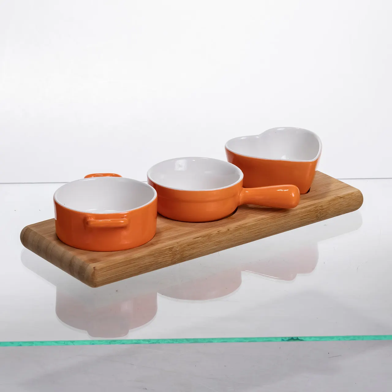 Набор менажниц фарфоровых 3 (шт) по 50 (мл) на бамбуковой подставке Оранжевый HZ001-O представляет собой практичное и стильное решение для подачи соусов, специй и закусок. В комплект входят три менажницы разных форм: круглая с двумя ручками, круглая с одной ручкой и сердцевидная без ручек, что позволяет насытить сервировку оригинальностью и разнообразием. Каждая менажница изготовлена из высококачественного фарфора, обеспечивающего долговечность и безопасность при эксплуатации.