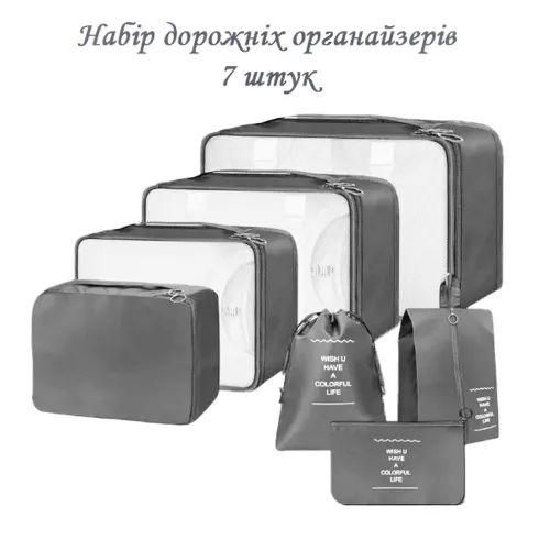 Будьте готові до нових пригод, знаючи, що ваші речі надійно захищені та акуратно упаковані. Замовляйте Набор органайзеров для путешествий 7 размеров в серый LoveYouHome, щоб насолоджуватися кожною подорожжю!