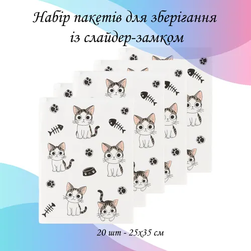 Описание набора пакетов для хранения с слайдер-замком "Кошки" 25×35 см, 20 шт