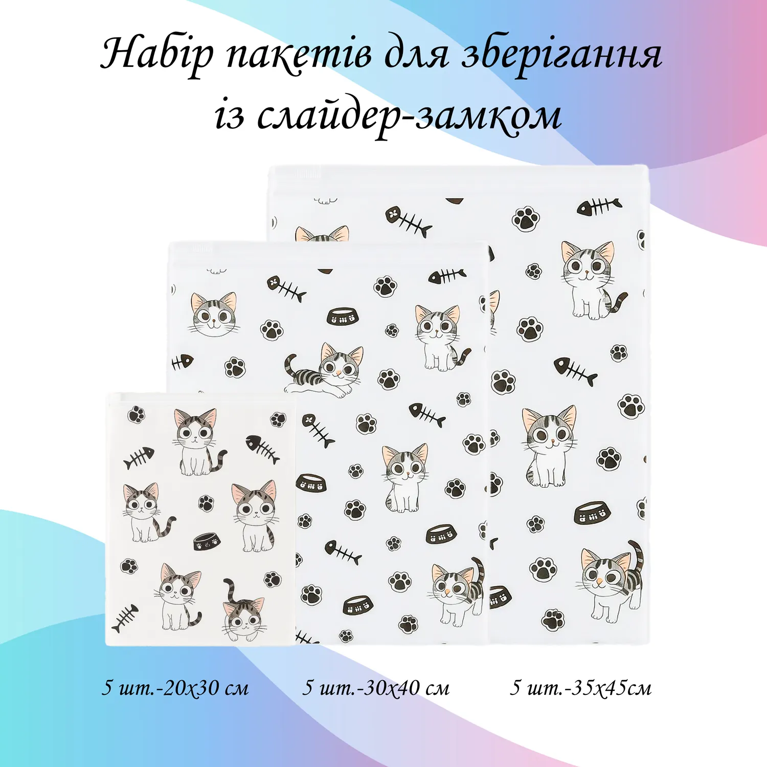 Матеріал пакетів забезпечує довговічність, вони витримують сотні циклів відкривання/закривання без втрати форми. Також вони зручні для розподілу речей за категоріями завдяки стильному принту у вигляді котиків, що підвищує комфорт використання і допомагає швидко знаходити потрібне.