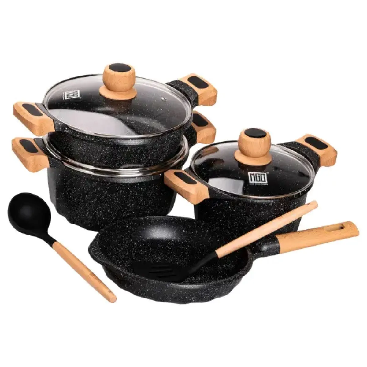 Набор посуды MGC HP-4-401B, включающий три кастрюли с антипригарным мраморным покрытием, силиконовую лопатку и половник, предназначен для удобного и здорового приготовления пищи. Основой набора служит литой алюминий с многослойным дном, обеспечивающий равномерное распределение тепла, что позволяет максимально эффективно использовать энергию и сохранять полезные свойства продуктов.