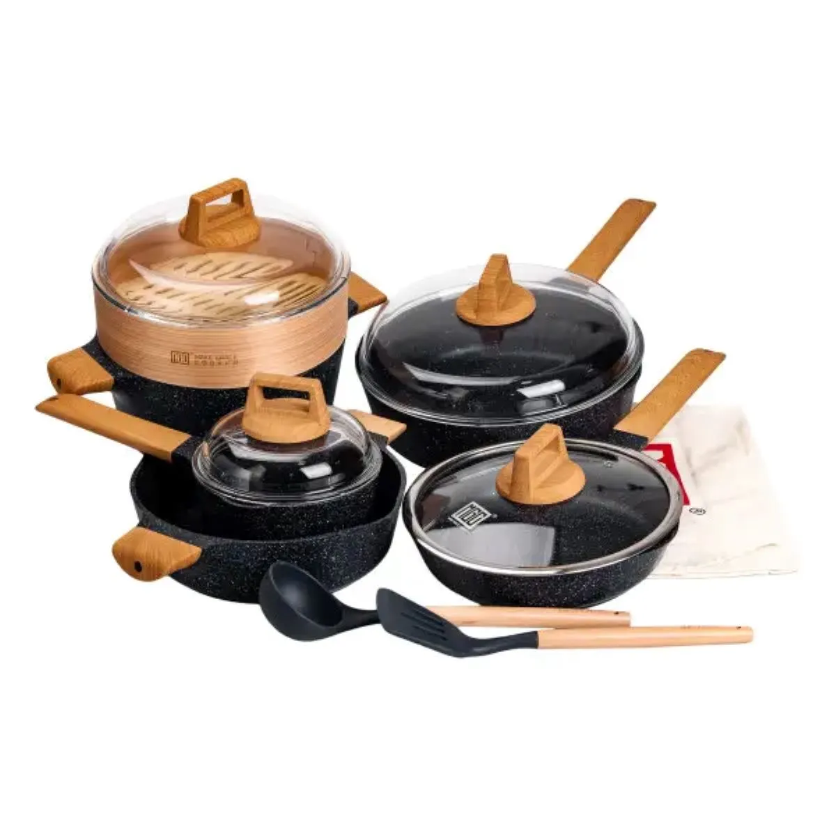 Дополнительные аксессуары в комплекте, такие как пароварка, половник и лопатка, делают этот набор особенно практичным и удобным в использовании, позволяя выполнять множество кулинарных задач без лишних затрат.