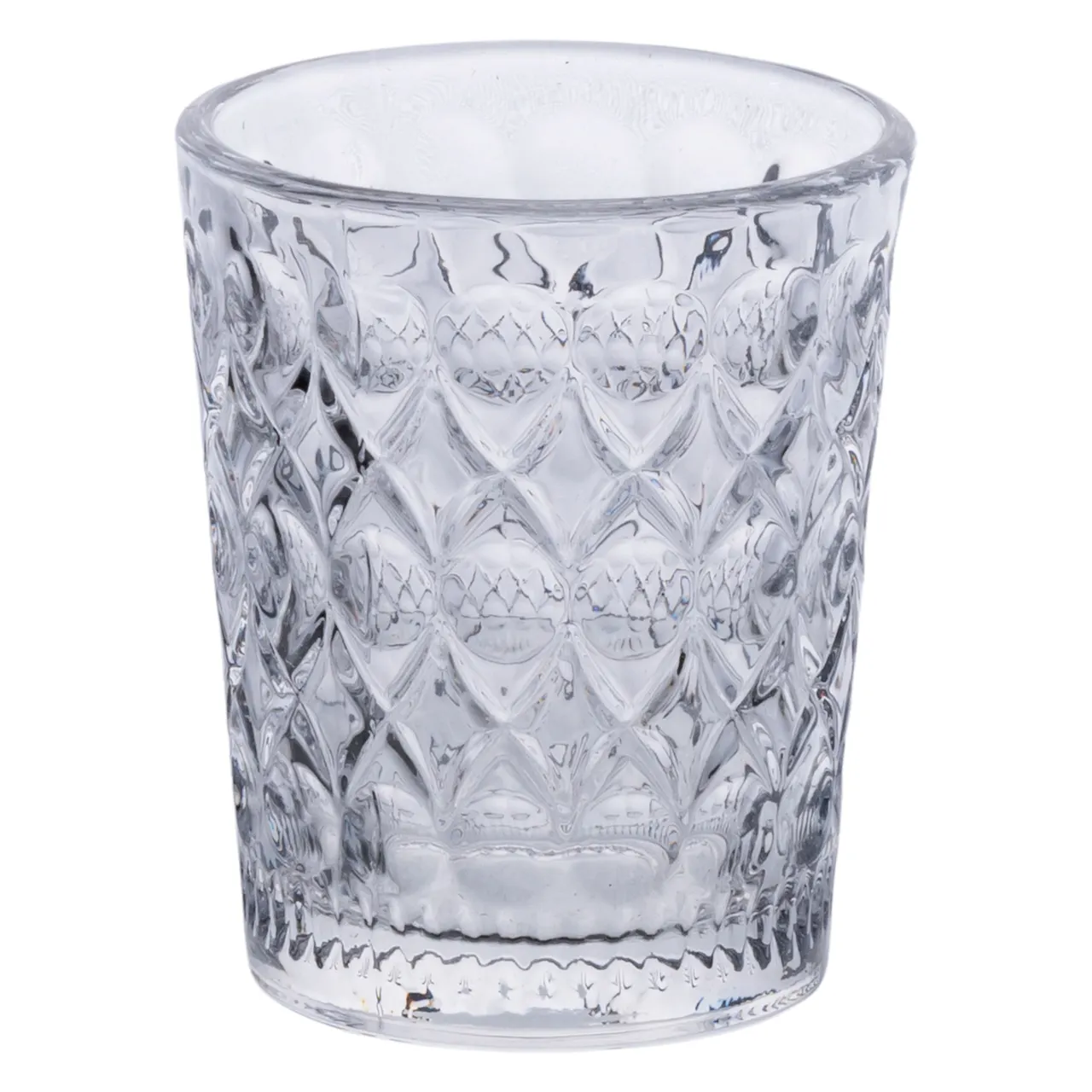 Набор стопок состоит из шести изделий, выполненных из прозрачного стекла с рельефным узором, напоминающим ромбовидные грани. Такая текстура покрывает внешнюю поверхность полностью, придавая стопкам солидный и эстетический вид. Каждая стопка имеет прямую форму с небольшим расширением к верхнему краю, что обеспечивает надежный захват и комфорт при использовании.