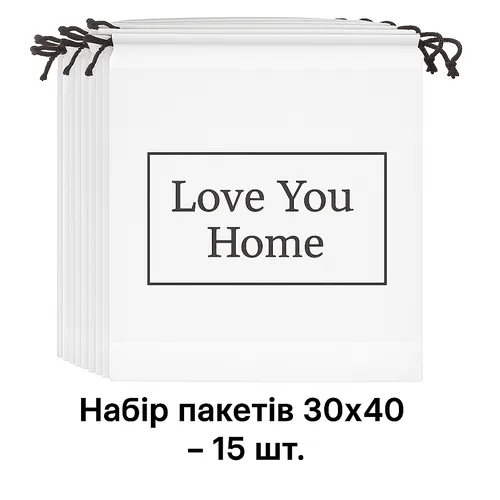 Набор сумок для хранения на завязках 30х40-15 шт. LoveYouHome — универсальное и удобное решение для организации пространства в доме, упаковки подарков и путешествий. Практичность, прочность и стильный дизайн делают эти пакеты оптимальным выбором для повседневного использования.