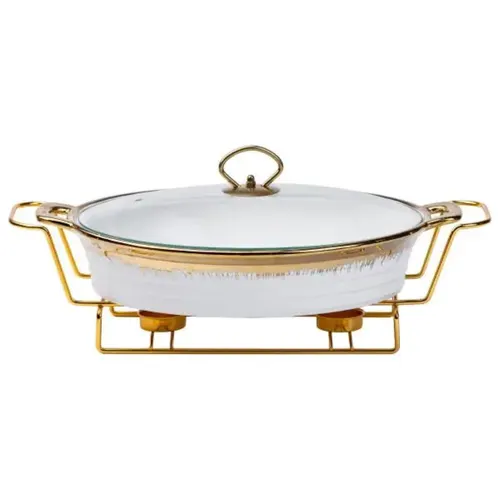 Мармит оснащен стеклянной крышкой, которая позволяет визуально контролировать содержимое без необходимости открывать емкость. Металлическая подставка из нержавеющей стали обеспечивает надежную устойчивость и безопасность при эксплуатации блюда на любом столе.
