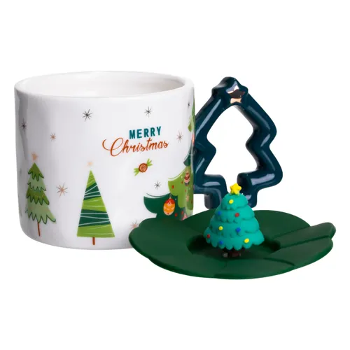 Особенность чашки заключается в необычной ручке в виде зелёной ёлочки и оригинальной керамической крышке с 3D-фигуркой новогоднего дерева. Такой дизайн не только подчёркивает праздничное настроение, но и обеспечивает удобство при использовании.