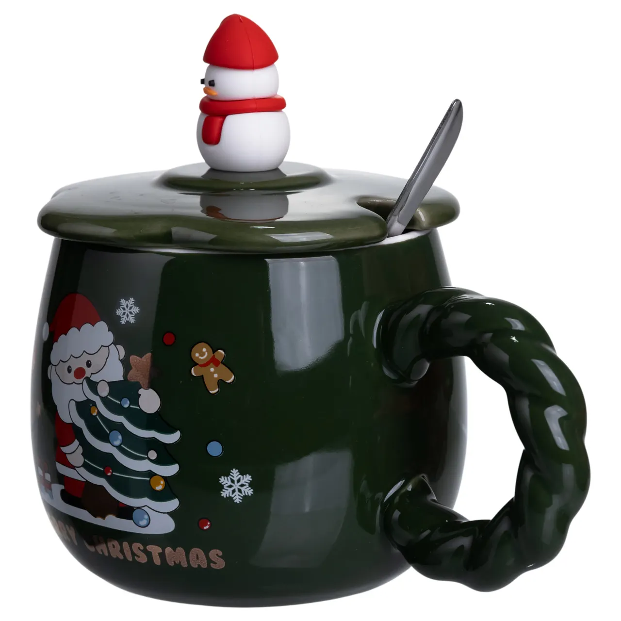 Главной особенностью набора является продуманная комплектация: керамическая крышка с милой объемной 3D-фигуркой (снеговик, олень и другие персонажи), которая служит удобной ручкой для крышки, а также металлическая ложечка для комфортного размешивания напитков.