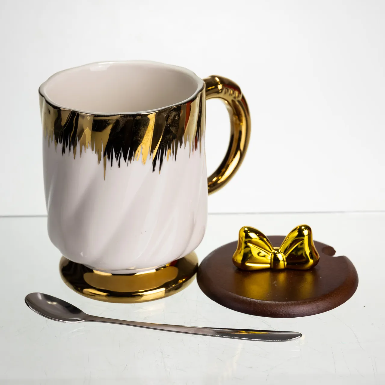 Прочная крышка из материала, имитирующего темное дерево, оснащена изящной ручкой в виде золотого бантика. Благодаря ей напиток дольше остается горячим и сохраняет аромат. В комплект входит также металлическая ложка с утонченным дизайном, идеально подходящая по стилю к чашке.