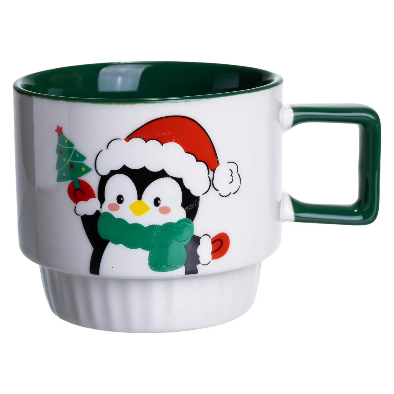 В отличие от обычных чашек, изделие украшено изящным изображением пингвина и сочетанием белого и зеленого цветов, что символизирует зимнюю тематику и праздничный дух. Такой декоративный элемент помогает создавать теплую и радостную атмосферу, особенно в холодное время года.