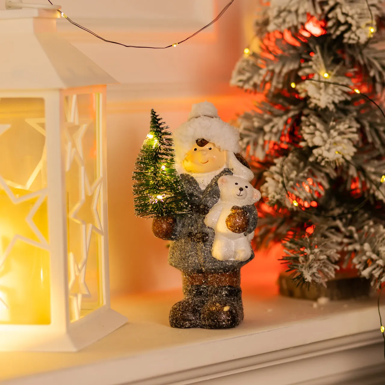 Основное декоративное значение придаёт миниатюрная елка в руках девочки, украшенная мини-огоньками. Подсветка, встроенная в фигурку, обеспечивает мягкое и приятное освещение, которое подчёркивает все детали и делает композицию заметной даже в тёмное время суток. Такой дизайн отлично впишется в новогодний интерьер, станут акцентом праздничного декора и радует глаз гостей и домочадцев.