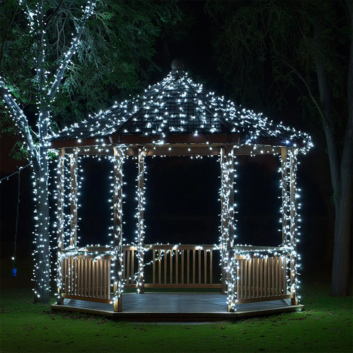 Гирлянда оснащена 1000 LED-лампами, которые расположены через каждые 9 см на чёрном проводе общей длиной 100 метров. Это позволяет создавать световые композиции любой протяжённости и сложности, украшая фасады зданий, декоративные элементы сада, балконы или внутренние помещения. Возможность работы от сети или солнечной батареи обеспечивает автономность и экономию электроэнергии.