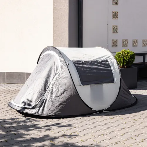 Палатка туристическая 245×145×100 см, выполненная в сером цвете и оборудованная системой быстрого развертывания Pop-Up, предназначена для комфортного размещения двух человек. Она изготовлена из прочного и водонепроницаемого материала Оксфорд, который успешно блокирует ультрафиолетовое излучение, сохраняя оптимальный микроклимат внутри даже в солнечную погоду. Высота палатки составляет 100 см, что обеспечивает удобство при нахождении внутри.