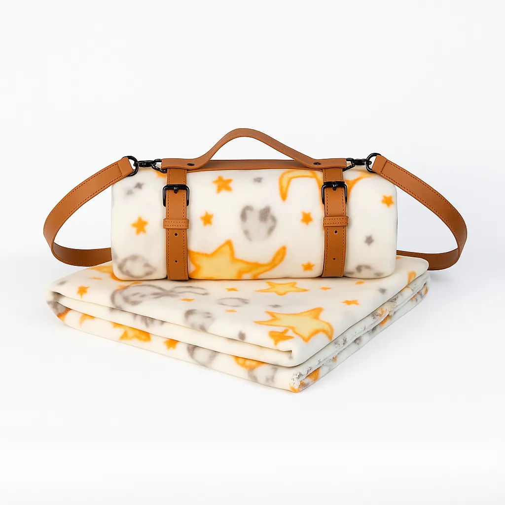 Плед «Месячная сказка» поєднує легкість, функціональність і привабливий дизайн, що не завжди зустрічається у аналогів. Унікальний ремінь-держатель із ручкою є значним плюсом для тих, хто часто подорожує.