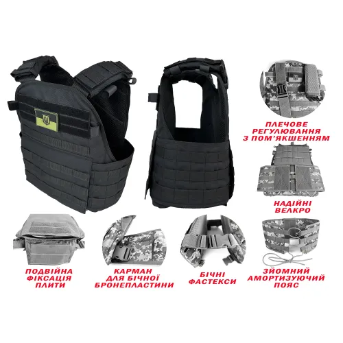 Цвет модели — черный, а вес составляет всего 1.1 кг. Это делает плитоноску легкой и удобной в долгосрочном использовании без ущерба для защиты.