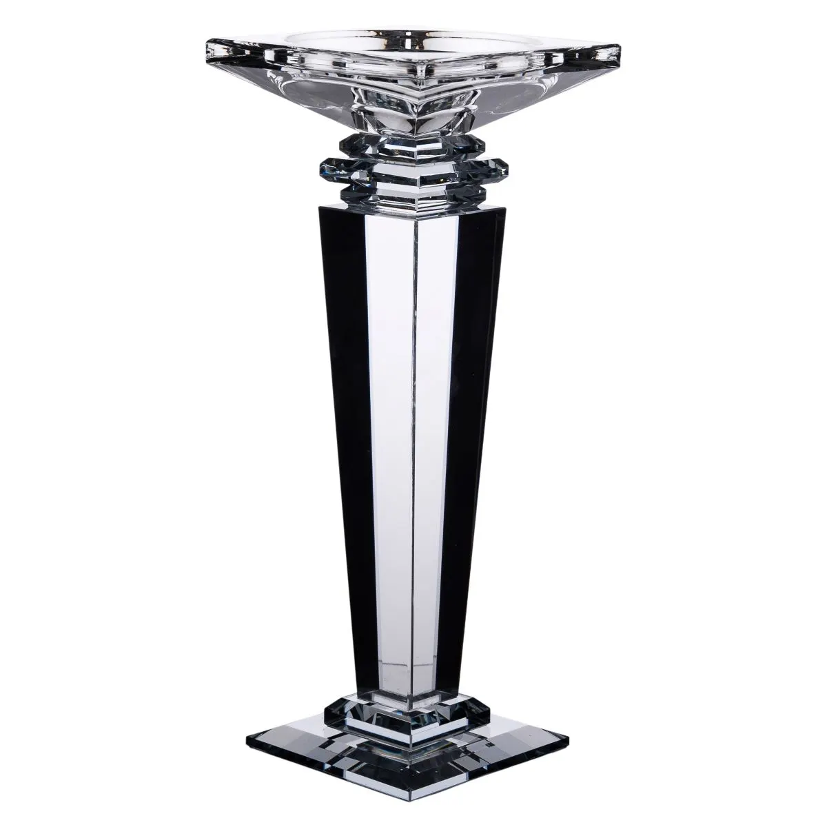 Данный декоративный подсвечник изготовлен из прозрачного стекла и имеет строгую геометрическую форму, что придаёт изделию современный и элегантный облик. Высокая ножка с гранёной структурой напоминает архитектурную колонну, подчёркивая стилевую выдержанность изделия. Квадратная чаша для свечи массивная и одновременно прозрачная, что делает подсвечник эффектным элементом декора.