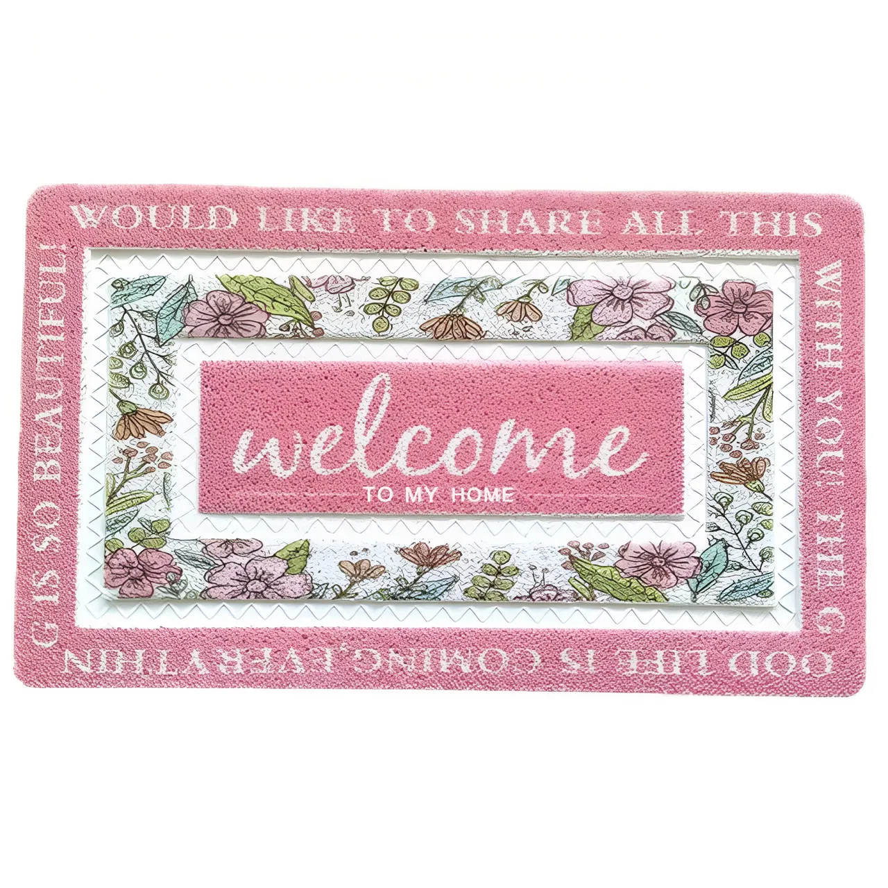 Прихожий коврик размером 60х40 см модели HP-47-1P сочетает в себе эстетическую привлекательность и практичность. Изделие украшено изящным цветочным узором и текстовой надписью «Welcome to my home», которая задаёт дружелюбный тон всей входной зоне.