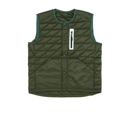 Жилет имеет прямой воротник и застегивается на пять кнопок. Его дизайн дополняют внутренний карман и три внешних, один из которых застегивается на молнию со светоотражающими вставками. Эластичные проймы обеспечивают плотное прилегание к телу для защиты от ветра.