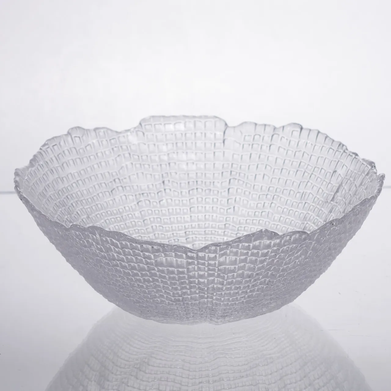 Эта салатница отличается сочетанием эстетики и функциональности. Текстурное стекло с эффектом плетения — редкое дизайнерское решение, которое делает изделие одновременно стильным и практичным. Фигурный волнистый край выделяет салатницу на фоне стандартных моделей, придавая изящества и индивидуальности.