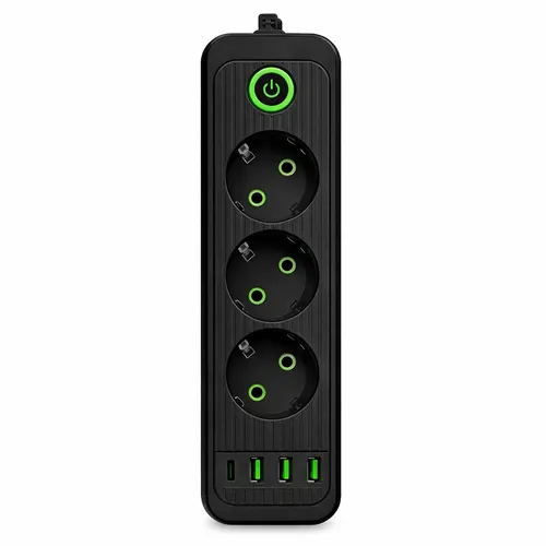 Сетевой фильтр-удлинитель черного цвета с тремя розетками, тремя USB-A портами и одним USB-C портом создан для универсального подключения бытовой техники и зарядки современных мобильных устройств в одном месте. Формат 3 розетки плюс 3 USB-A плюс 1 USB-C позволяет максимально оптимизировать использование доступного пространства и значительно уменьшить количество отдельных адаптеров, занимающих розетки. Кабель питания длиной 5 метров обеспечивает исключительную гибкость в размещении подключаемых устройств на большом расстоянии от основной стационарной точки электроснабжения, что особенно важно для просторных помещений, офисных зон и студий. Особенности сетевого фильтра-удлинителя: Компактный вертикальный формат корпуса с тремя стандартными евророзетками — гарантирует надежное и стабильное подключение разнообразной бытовой техники и электронных приборов; Три USB-A порта и один современный USB-C порт на передней панели — дают возможность одновременно заряжать смартфоны, планшеты, беспроводные наушники, внешние аккумуляторы и другие цифровые гаджеты, включая устройства с новейшими интерфейсами зарядки; Кнопка питания с индикатором — обеспечивает быстрое и удобное отключение электропитания всех подключенных устройств одновременно одним нажатием, что экономит электроэнергию и повышает безопасность использования; Продуманное эргономичное расположение розеток и USB-портов — конструкция спроектирована таким образом, что при одновременном подключении нескольких устройств они не блокируют доступ друг к другу и не создают неудобств. Характеристики сетевого фильтра-удлинителя: Тип: сетевой фильтр-удлинитель; Количество выходных розеток: 3 шт.; Количество USB-портов: 3 шт. USB-A, 1 шт. USB-C; Длина кабеля: 5 м; Длина шнура: 5 м; Тип розеток: европейский стандарт; Кнопка питания: да, с индикатором; Входная вилка: евро; Выходная розетка: евро; Цвет корпуса: черный; Тип устройства: мережевий фільтр-подовжувач; Состояние: новый. Удлинитель идеально подходит для использования в домашних условиях, офисных пространствах или учебных помещениях. Это оптимальное решение для организации эргономичного рабочего места или удобной зоны отдыха, где требуется одновременное подключение большого количества электронных устройств и современных гаджетов с различными типами зарядных портов.