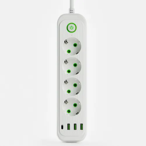 Сетевой фильтр-удлинитель белого цвета объединяет четыре розетки, три USB-A порта и один USB-C разъём — универсальное решение для подключения бытовых приборов и одновременной зарядки смартфонов, планшетов и других гаджетов. Комбинация розеток и USB-портов помогает рационально использовать электропитание и освобождает пространство от лишних зарядных устройств. Кабель длиной 3 метра даёт свободу в размещении техники вдали от стационарной розетки. Особенности сетевого фильтра-удлинителя: Компактный вертикальный корпус — экономит место и позволяет разместить удлинитель в любом удобном месте; Четыре евророзетки стандарта Euro — обеспечивают надёжное подключение электроприборов; Три USB-A и один USB-C разъём — для зарядки мобильных устройств, наушников, повербанков без дополнительных адаптеров; Кнопка питания с индикацией — позволяет мгновенно обесточить все подключённые устройства одним нажатием; Удобное расположение разъёмов — розетки и USB-порты не перекрывают друг друга при одновременном использовании. Характеристики сетевого фильтра-удлинителя: Количество выходных розеток: 4 шт; Выключатель: Да; Длина шнура: 3 м; Входная вилка: Евро; Выходная розетка: Евро; Цвет корпуса: Белый; Длина провода: 3 м; Мощность нагрузки: 2500 Вт. Удлинитель идеально подходит для домашнего использования, офиса или учебного пространства. Надёжная конструкция и продуманное расположение элементов делают его отличным выбором для организации рабочего места или зоны отдыха, где требуется подключение нескольких устройств одновременно.
