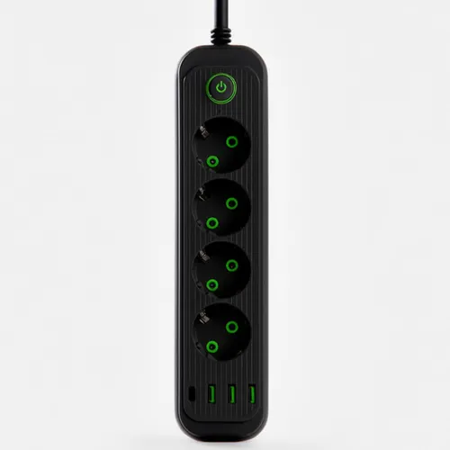 Сетевой фильтр-удлинитель чёрного цвета с четырьмя розетками и тремя USB-портами разработан для одновременного питания электроприборов и зарядки мобильной техники. Формат с четырьмя розетками и тремя USB-разъёмами позволяет эффективно распределить нагрузку и избавиться от избытка зарядных адаптеров в розетке. Трёхметровый кабель обеспечивает гибкость в расположении устройства относительно источника питания. Особенности сетевого фильтра-удлинителя: Вертикальный компактный корпус — занимает минимум места и легко интегрируется в любой интерьер; Четыре стандартные евророзетки — для подключения бытовой техники, компьютеров, освещения; Три USB-порта на передней панели — удобная зарядка смартфонов, наушников, пауэрбанков и других гаджетов; Кнопка питания с индикатором — быстрое отключение всех устройств одновременно для экономии энергии; Продуманная конструкция — розетки и USB-порты размещены так, чтобы не мешать друг другу при использовании. Характеристики сетевого фильтра-удлинителя: Количество выходных розеток: 4 шт; Выключатель: Да; Длина шнура: 3 м; Входная вилка: Евро; Выходная розетка: Евро; Цвет корпуса: Чёрный; Тип удлинителя: Сетевой фильтр-удлинитель; Состояние: Новый; Длина провода: 4 м; Мощность нагрузки: 2500 Вт. Удлинитель отлично подходит для домашнего применения, офисных помещений или учебных аудиторий. Универсальное решение для создания организованного рабочего пространства или зоны релакса, где необходимо питание для множества устройств без хаоса проводов.