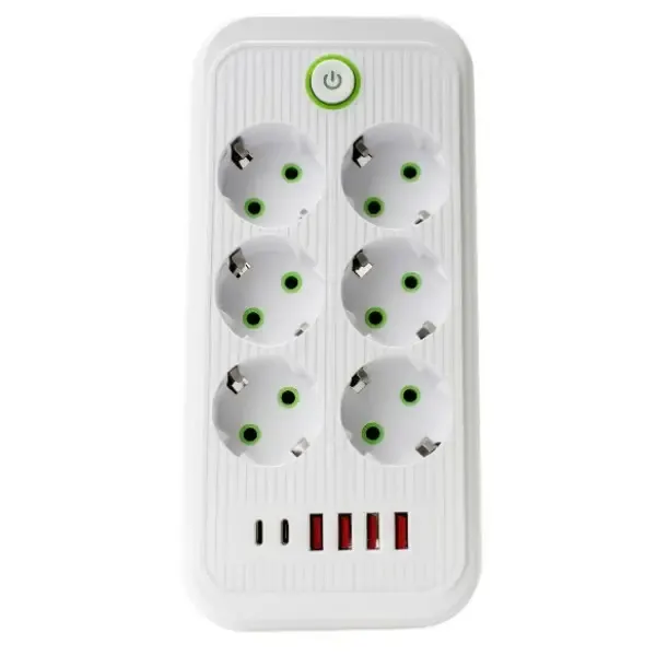 Сетевой фильтр-удлинитель с пятью розетками и USB портами позволяет организовать подключение нескольких устройств в одном месте. Формат 6 розеток + 4 USB-A +2 USB Type-C подходит для одновременного питания бытовой техники и зарядки мобильных гаджетов без дополнительных адаптеров. Это решение удобно использовать дома, в офисе или учебном пространстве, где важно оптимизировать доступ к электросети. Корпус изготовлен из огнестойкого ABS-пластика и имеет компактные размеры, что позволяет разместить удлинитель даже в ограниченном пространстве. Евророзетки расположены с учетом удобства подключения различных видов вилок. На корпусе предусмотрено 4 USB-A порта и 2 USB Type-C для зарядки смартфонов, планшетов, наушников и других устройств. Длина кабеля 5 метров обеспечивает гибкость в расположении, а кнопка питания с индикатором позволяет быстро выключать все подключенные устройства одновременно. Мощность до 2500 Вт дает возможность подключать бытовую технику средней нагрузки, что делает удлинитель практичным вариантом для ежедневного использования. Характеристики: Тип: сетевой фильтр-удлинитель Количество розеток: 6 Количество USB-A: 4 Количество USB Type-C: 2 Длина кабеля: 5 м Мощность: 2500 Вт Материал корпуса: огнестойкий ABS-пластик Тип розеток: европейский стандарт Кнопка питания: да, с индикатором Вес: 700 г Размеры: 23 × 11 × 4 см