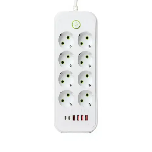 Сетевой фильтр-удлинитель с пятью розетками и USB портами позволяет организовать подключение нескольких устройств в одном месте. Формат 8 розеток + 4 USB-A +2 USB Type-C подходит для одновременного питания бытовой техники и зарядки мобильных гаджетов без дополнительных адаптеров. Это решение удобно использовать дома, в офисе или учебном пространстве, где важно оптимизировать доступ к электросети. Корпус изготовлен из огнестойкого ABS-пластика и имеет компактные размеры, что позволяет разместить удлинитель даже в ограниченном пространстве. Евророзетки расположены с учетом удобства подключения различных видов вилок. На корпусе предусмотрено 4 USB-A порта и 2 USB Type-C для зарядки смартфонов, планшетов, наушников и других устройств. Длина кабеля 5 метров обеспечивает гибкость в расположении, а кнопка питания с индикатором позволяет быстро выключать все подключенные устройства одновременно. Мощность до 2500 Вт дает возможность подключать бытовую технику средней нагрузки, что делает удлинитель практичным вариантом для ежедневного использования. Характеристики: Тип: сетевой фильтр-удлинитель Количество розеток: 8 Количество USB-A: 4 Количество USB Type-C: 2 Длина кабеля: 5 м Мощность: 2500 Вт Материал корпуса: огнестойкий ABS-пластик Тип розеток: европейский стандарт Кнопка питания: да, с индикатором Вес: 700 г Размеры: 27 × 11 × 4 см