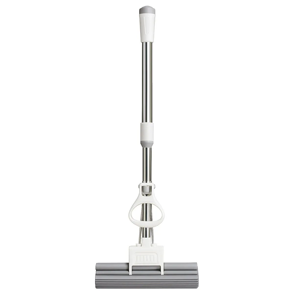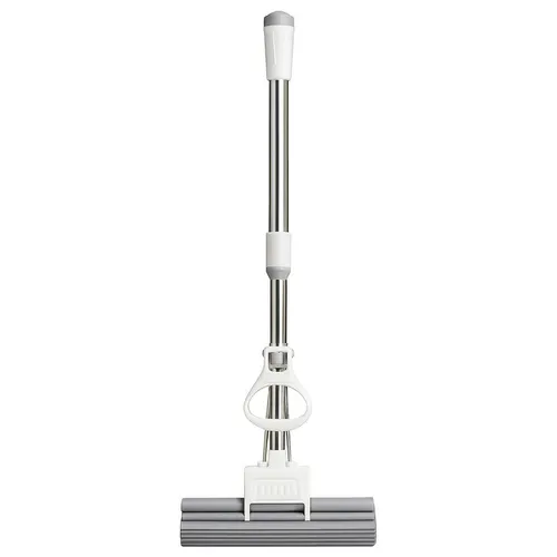 Рельефная верхняя часть ручки гарантирует удобный и надёжный захват, а центральный фиксатор крепко удерживает секции, предотвращая самопроизвольное смещение во время работы. Механизм отжима встроен непосредственно в корпус швабры, что обеспечивает комфортное удаление лишней жидкости с губчатой насадки без непосредственного контакта рук с водой.