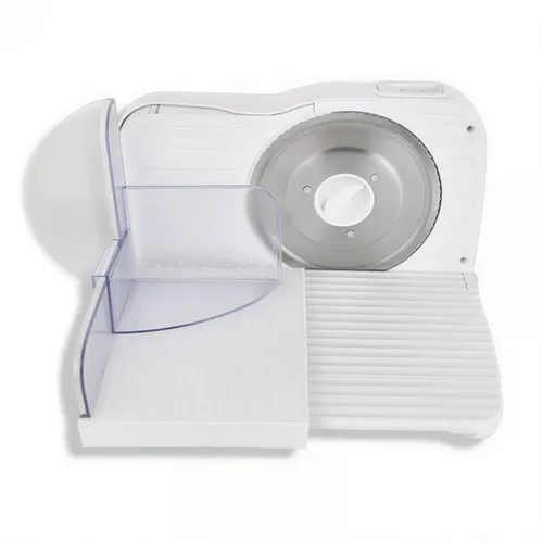 Слайсер изготовлен из качественных материалов, включая нержавеющую сталь для ножа и корпус из пластика с белым цветом покрытия. Модель предназначена для настольной установки и оснащена складным корпусом для удобного хранения. Устройство не имеет встроенного затачивающего устройства, зато оснащено съемным лезвием и защитным кожухом для безопасности пользователя.